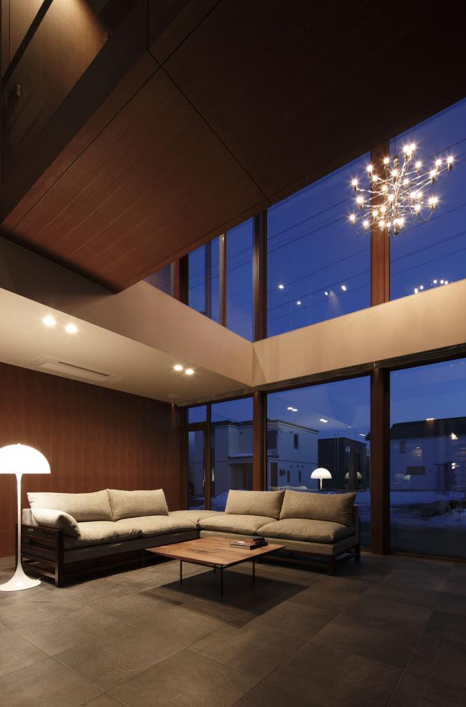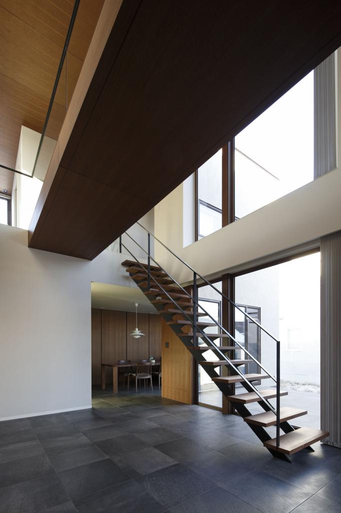 効率とコストを至上とする経済設計を皮肉ったようなこの住宅での行為と感受とは,リビングから書斎に行くのに,階段を上りUターンしてブリッジを渡り,寝室を抜けて再びブリッジを渡る必要性であり,キッチンからは,中庭を通してリビングルーム,さらに前面道路,向こう三軒まで見通せる視線である.
