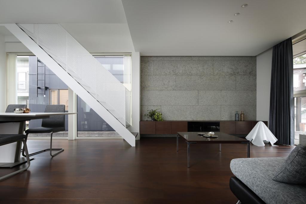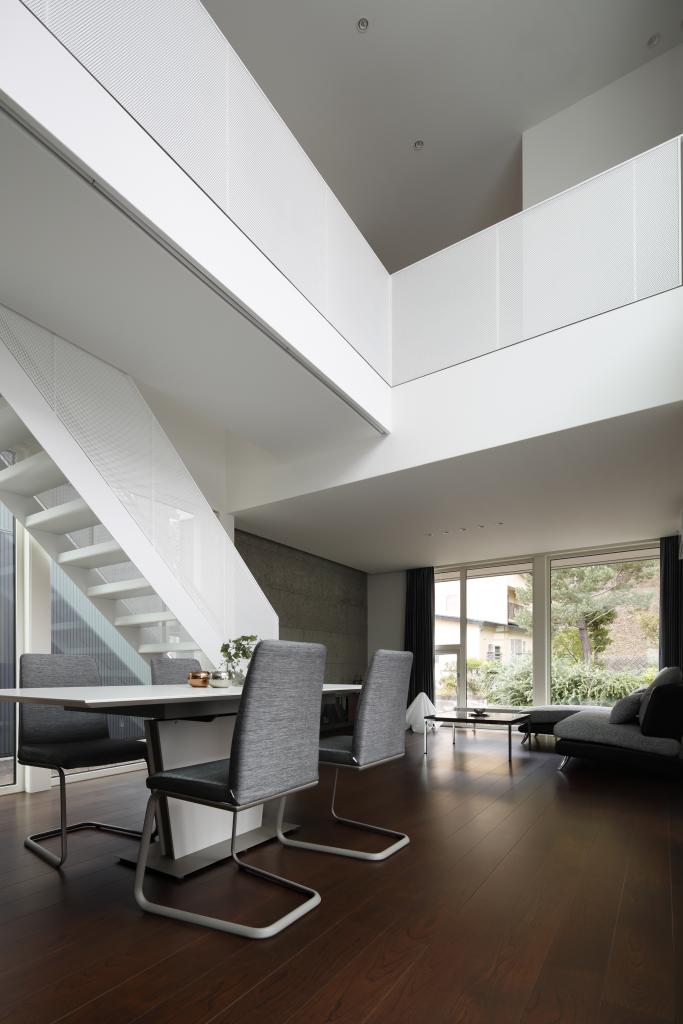 この住宅は二方向に大きな開口を持つ.一つは四季を楽しむべく穿たれた開口,もう一つは光を導く開口である.緑景には素直に開き,空景には中庭と吹抜を介して開いた.縦にも横にも閉塞的にならぬよう視線の抜けを確保し,その実現の為に空間を部屋として分節することをやめた.緑崖の庭,中庭,住宅という庭.中も外も庭と捉えたこの住宅は滞留する場所々々で見える景色も居心地も異なり,まさに回遊式庭園のような魅力を持ち合わせているのである.