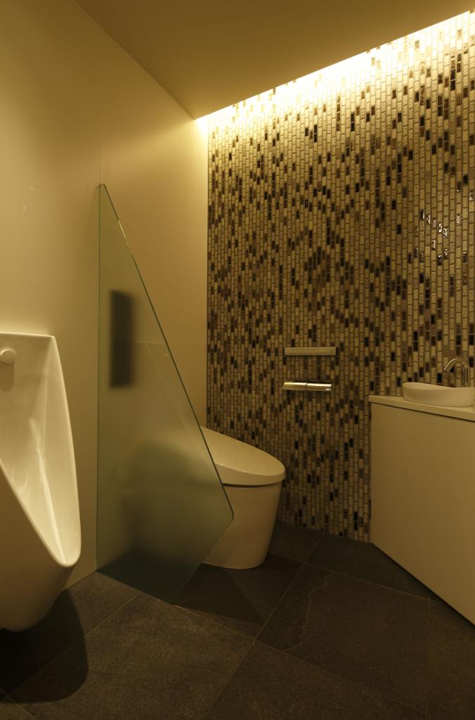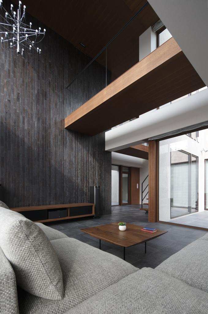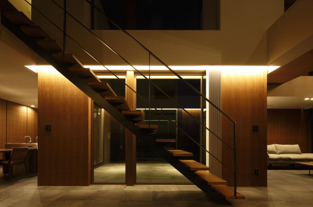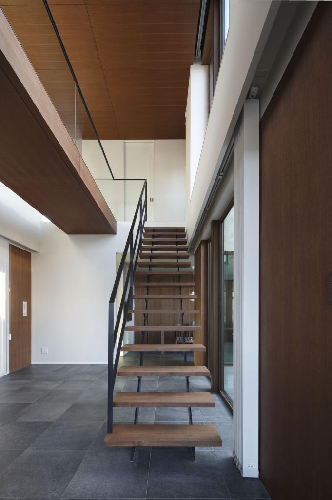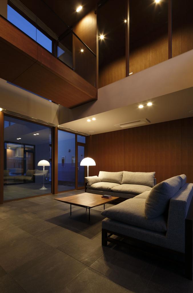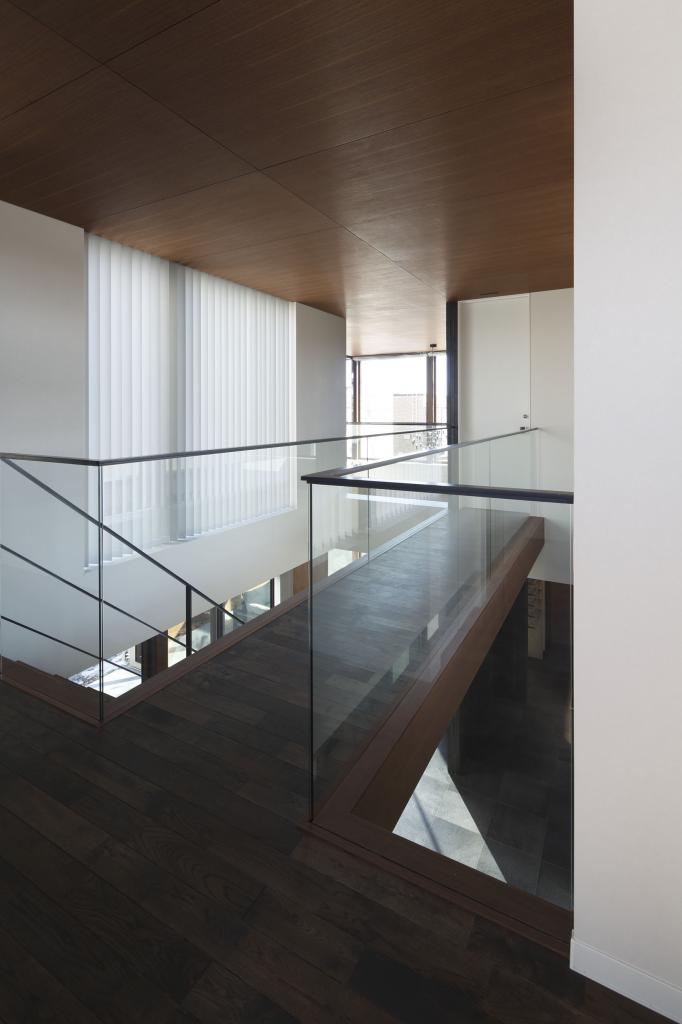効率とコストを至上とする経済設計を皮肉ったようなこの住宅での行為と感受とは,リビングから書斎に行くのに,階段を上りUターンしてブリッジを渡り,寝室を抜けて再びブリッジを渡る必要性であり,キッチンからは,中庭を通してリビングルーム,さらに前面道路,向こう三軒まで見通せる視線である.