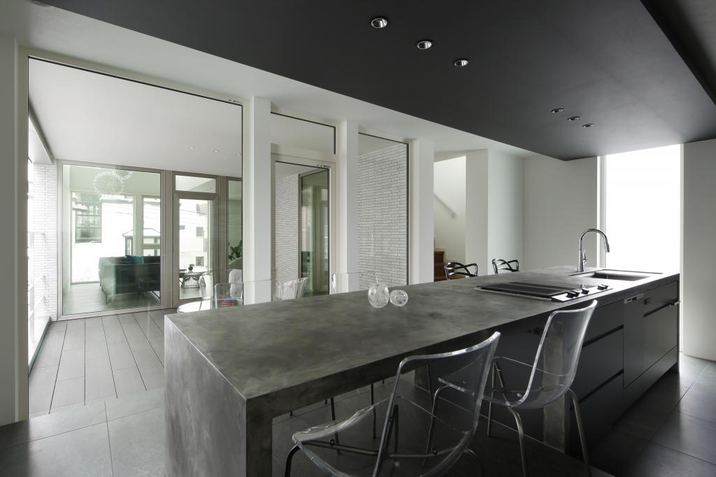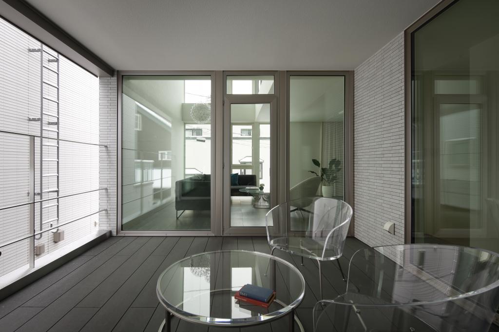 視線はダイニングから半屋外テラス,リビング,外部へと透過し,寝室からリビング,テラスへと抜ける.